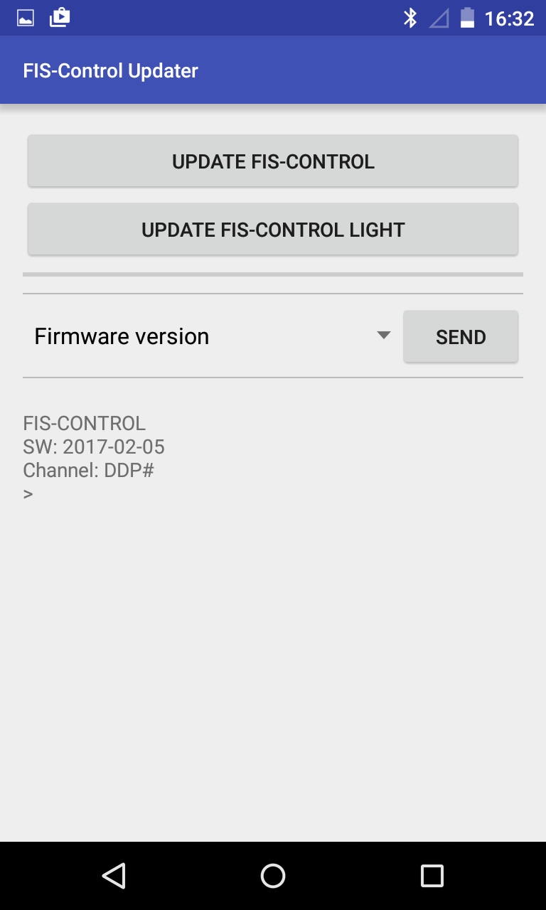 Now the bluetooth module of the FIS-Control is activated. Pair your Android device with the FIS-Control. The PIN code is '1234'. Now start the app. The FIS-Control will be shown in the selection list. Select it there. On the next screen you should see the character "C" printed once per second. This indicates that the FIS-Control is ready to receive a file. Click "Upload file to FIS-Control" and pick the firmware file. The update will take about 3 minutes.